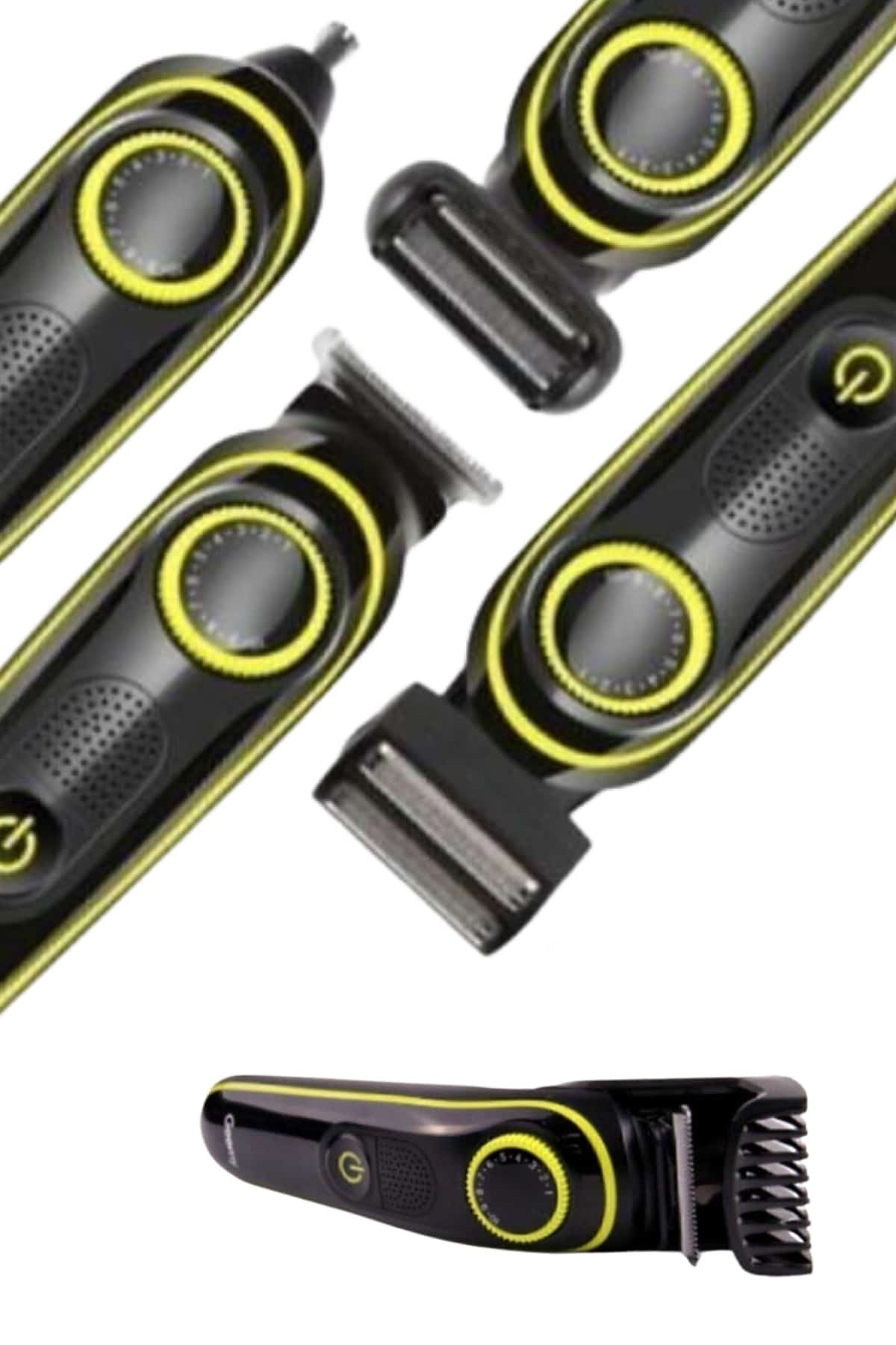 Bu 5’i 1 arada çok fonksiyonlu bakım seti, kişisel bakım rutininizi daha pratik ve etkili hale getiriyor. Saç kesimi, sakal tıraşı, burun ve kulak kılı temizliği, detaylı şekillendirme ve vücut tıraşı gibi birden fazla işlevi tek cihazda sunarak, tam kapsamlı bakım imkanı sağlıyor. Güçlü motoru ve paslanmaz çelik bıçakları ile pürüzsüz bir tıraş deneyimi sunarken, uzun ömürlü ve keskin yapısı sayesinde her kullanımda yüksek performans elde edebilirsiniz. Kablosuz ve şarjlı kullanımı sayesinde hareket özgürlüğü tanır; tam dolu batarya ile uzun süreli kullanım imkanı sunar. Farklı kesim uzunlukları için ayarlanabilir tarak başlıkları mevcuttur; bu sayede kişisel stilinize uygun şekillendirmeyi zahmetsizce gerçekleştirebilirsiniz. Ergonomik tutuşa sahip şık ve modern tasarımı, hem kullanım kolaylığı sağlar hem de banyo alanınıza estetik bir katkı sunar. Üzerindeki LED gösterge, pil seviyesini anlık olarak takip etmenize olanak tanırken, düşük sesli çalışması ile her ortamda konforlu bir kullanım deneyimi yaşatır. Suya dayanıklı başlıkları ve çıkarılabilir bıçakları sayesinde temizlik işlemleri oldukça kolaydır; hijyenik kullanım için yalnızca düzenli olarak yıkamanız yeterlidir.